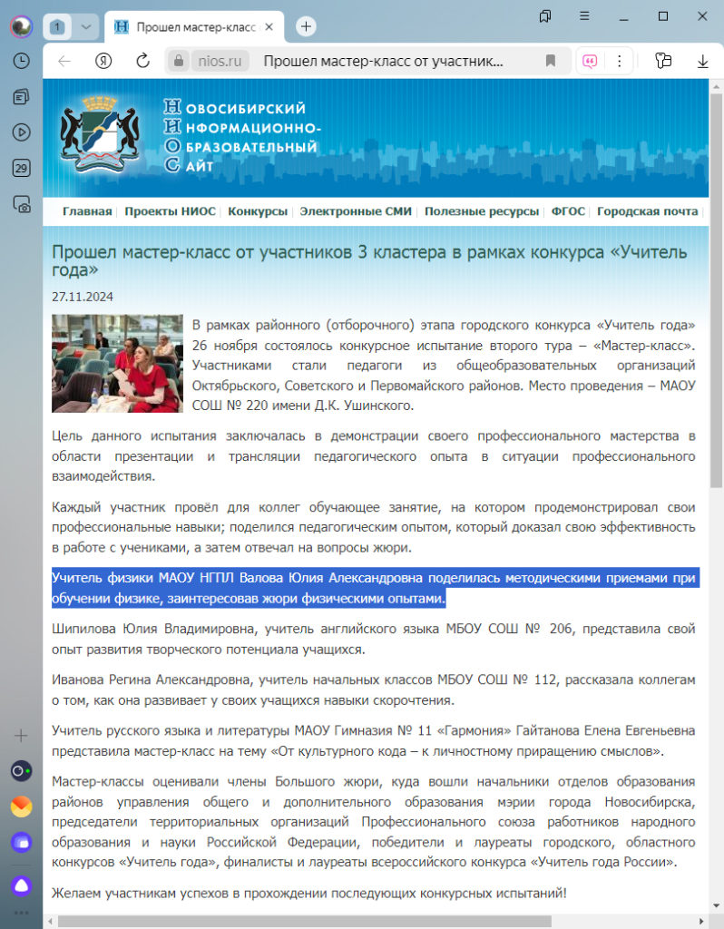 - Мастер-класс «Методические приемы при обучении физики» в рамках участия в конкурсе «Учитель года» районного (отборочного) этапа городского конкурса, ноябрь 2024 г.