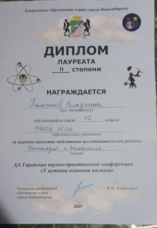 - XX городской научно-практической конференции «У истоков освоения космоса», Пальчиков Владислав -10 кл -2 место, АКЛ имени Ю.В.Кондратюка,19.11.2025 г.