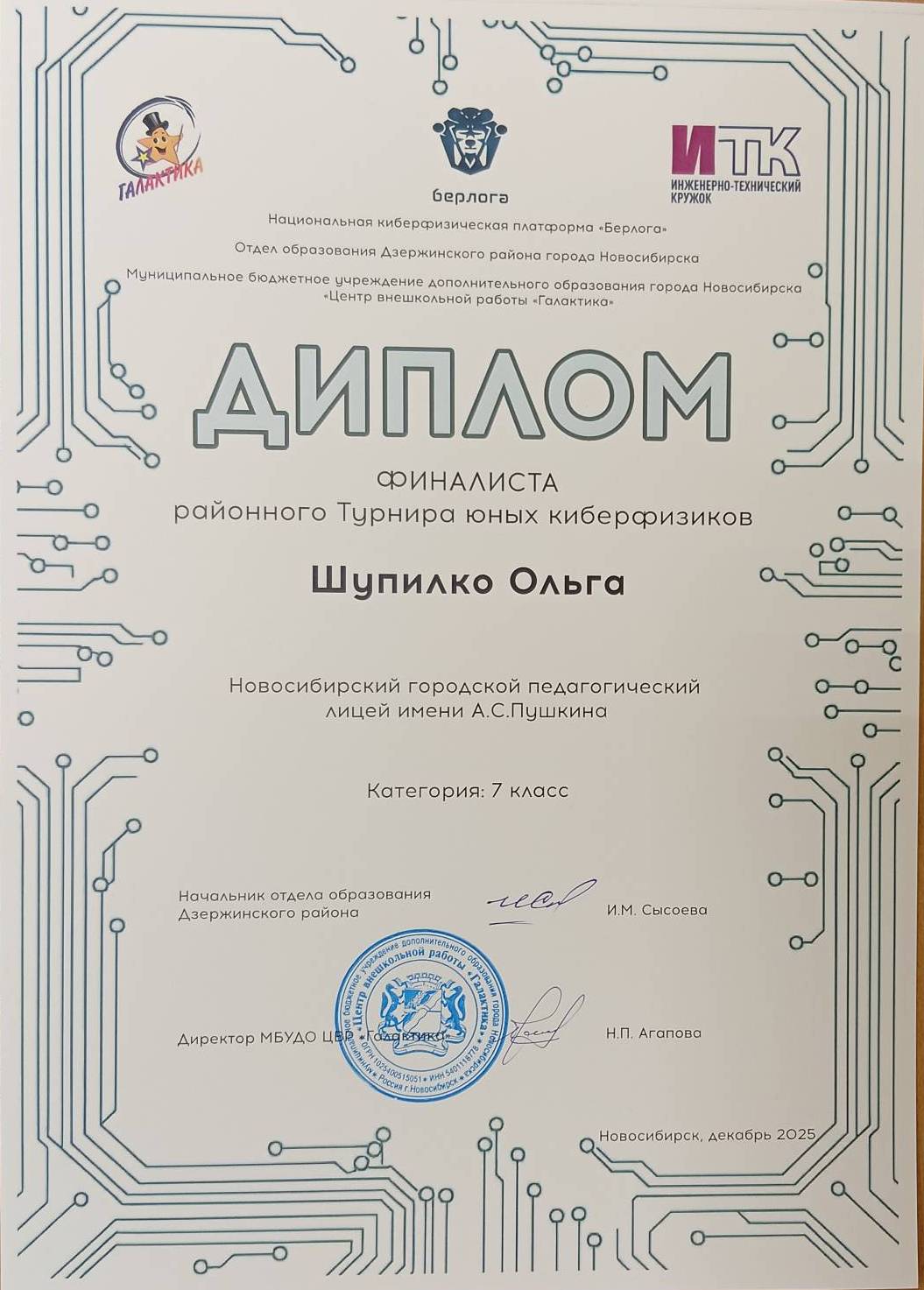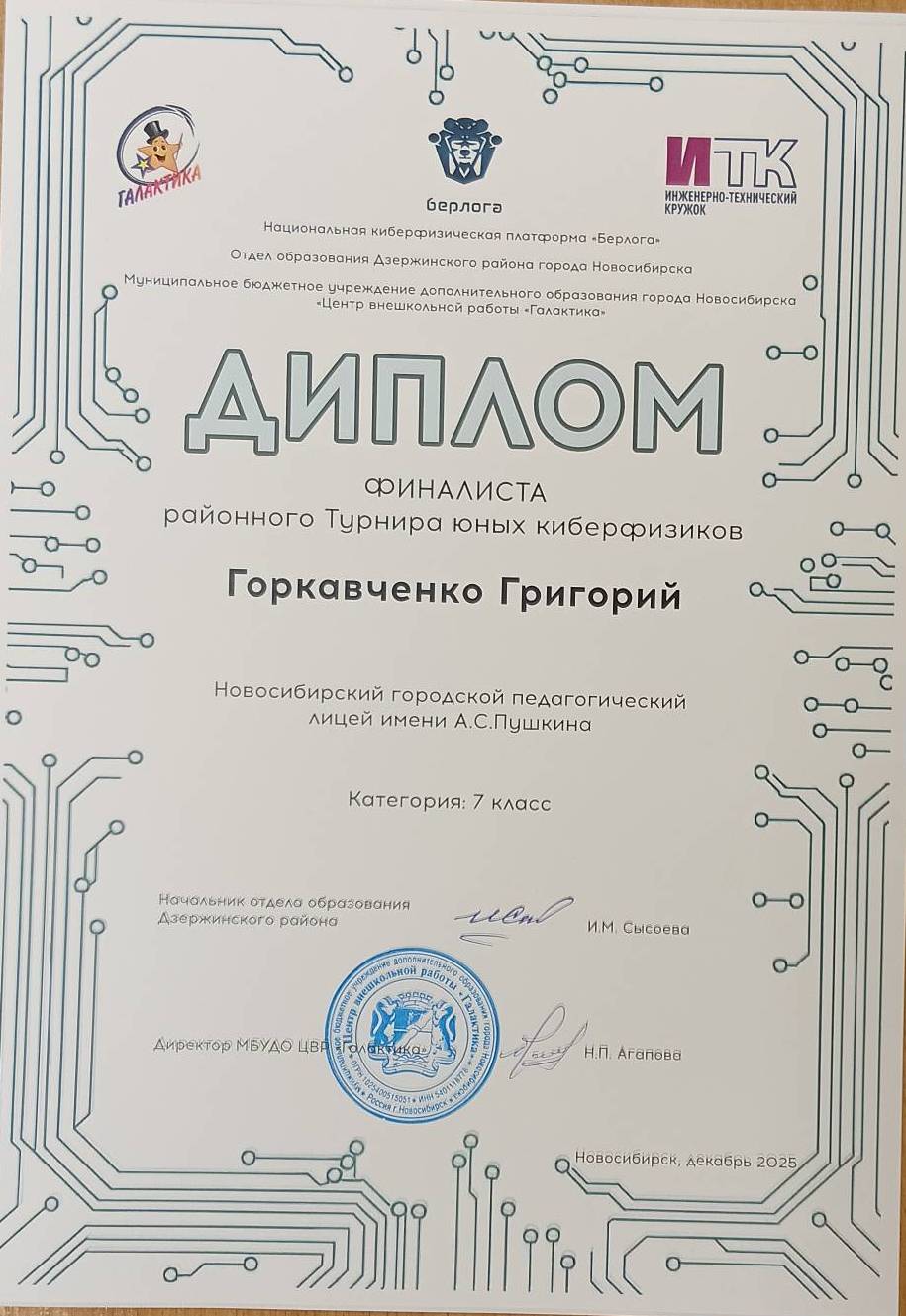 - Участие в турнире юных киберфизиков, районный этап, Центр внешкольной работы «Галактика», Горкавченко Григорий, Шумилко ольга-7В класс, 13 ноября 2025 г., финалисты.