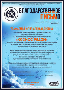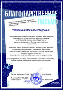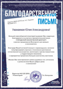 - Благодарственное письмо в просветительской акции «Городского космического диктанта» в рамках празднования Всемирного дня авиации и космонавтики. МАУ ДО ДЮЦ «Планетарий», апрель 2025 г.