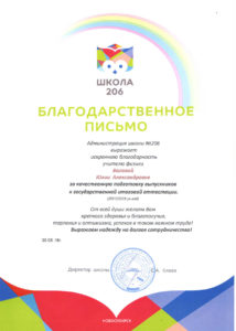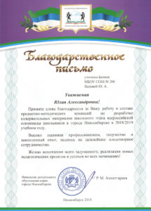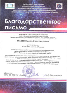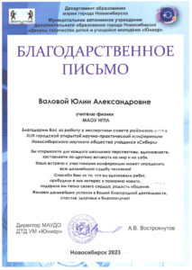 - Благодарственное письмо за работу в экспертном совете районного этапа городской открытой научно-практической конференции Новосибирского научного общества учащихся «Сибирь», МАУ ДО ДТДУМ «Юниор», декабрь 2024 г.