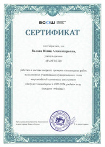 - Работа в жюри на муниципальном этапе всероссийской олимпиады школьников в 2023-2024 учебном году по физике, 09 ноября 2023 г., МАУ ДПО «НИСО».