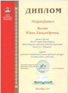 - Диплом лауреата районного (отборочного) этапа городского конкурса «Учитель года» в 2024 году, мэрия города Новосибирска департамент образования, декабрь 2024 г.