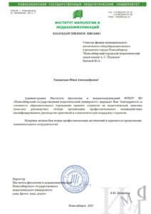 - Благодарственное письмо от администрации Института филологии и медиакоммуникаций ФГБОУ ВО «Новосибирский государственный педагогический университет», март 2025 г.