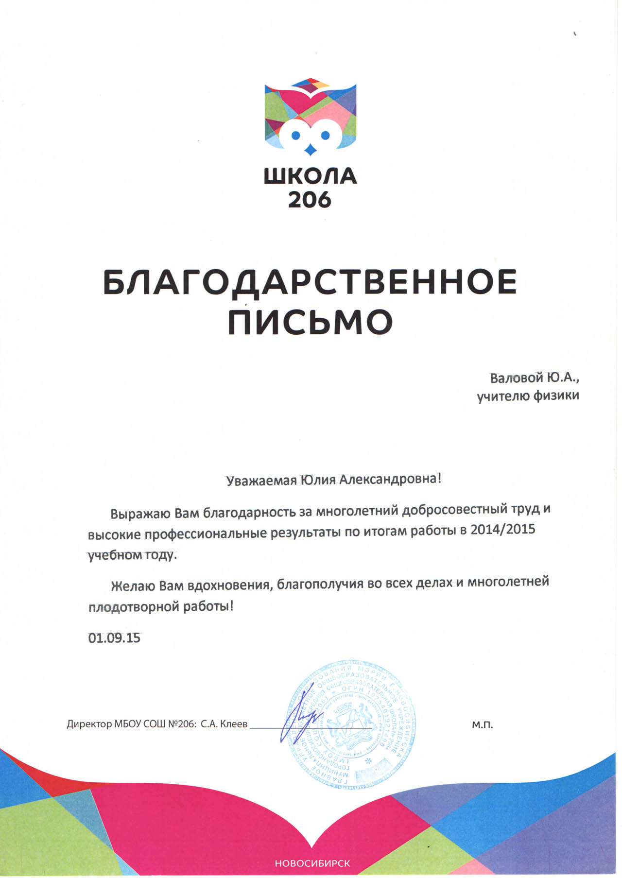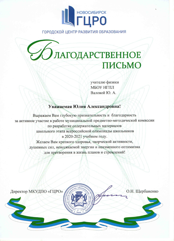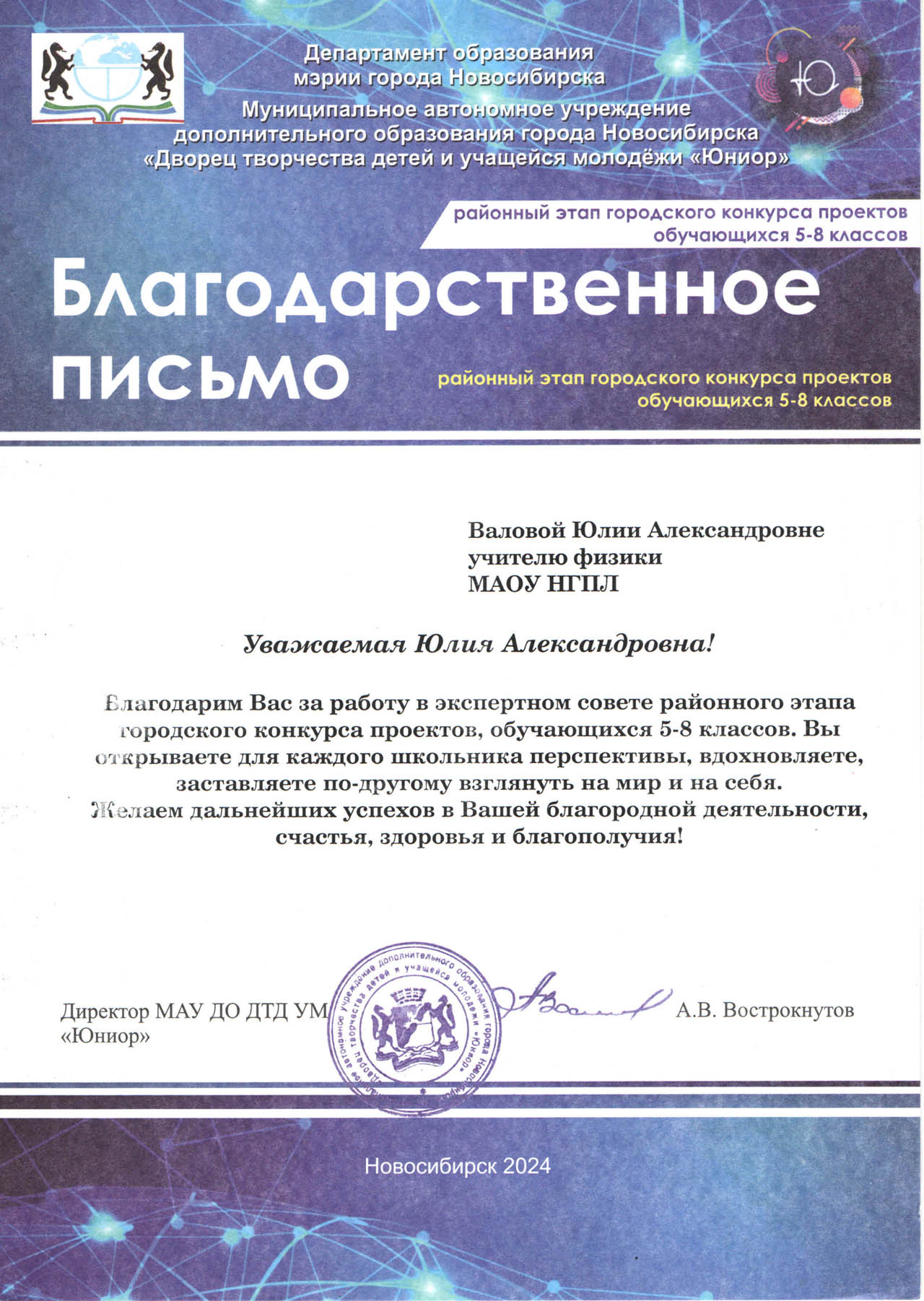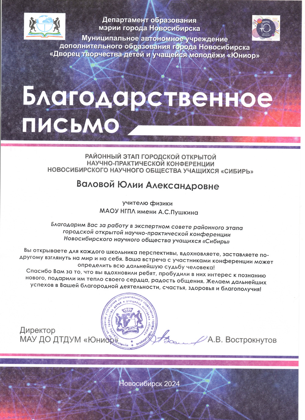 - Благодарственное письмо за работу в экспертном совете районного этапа городской открытой научно-практической конференции Новосибирского научного общества учащихся «Сибирь», МАУ ДО ДТДУМ «Юниор», декабрь 2024 г.