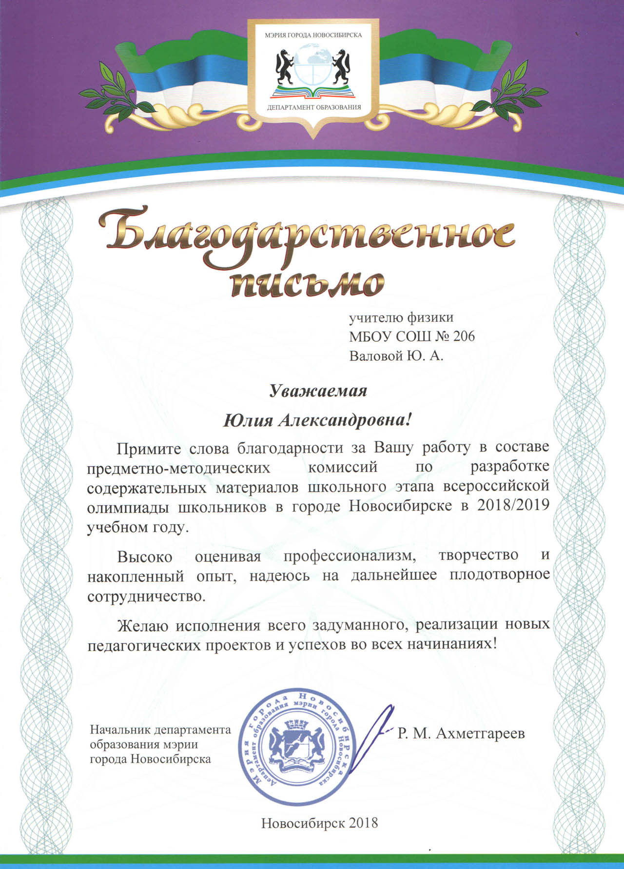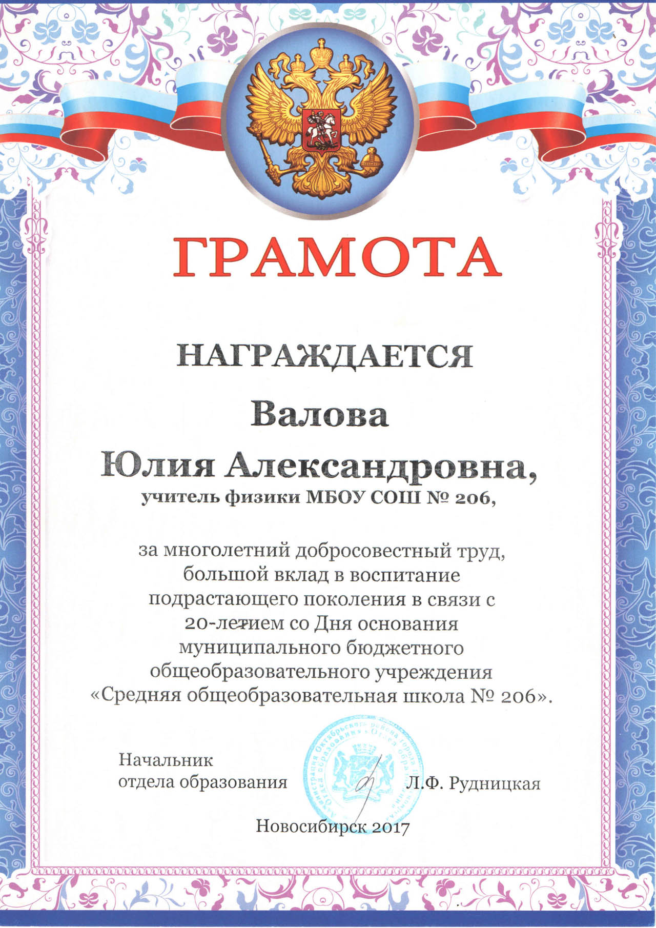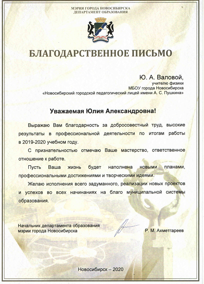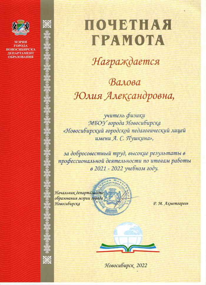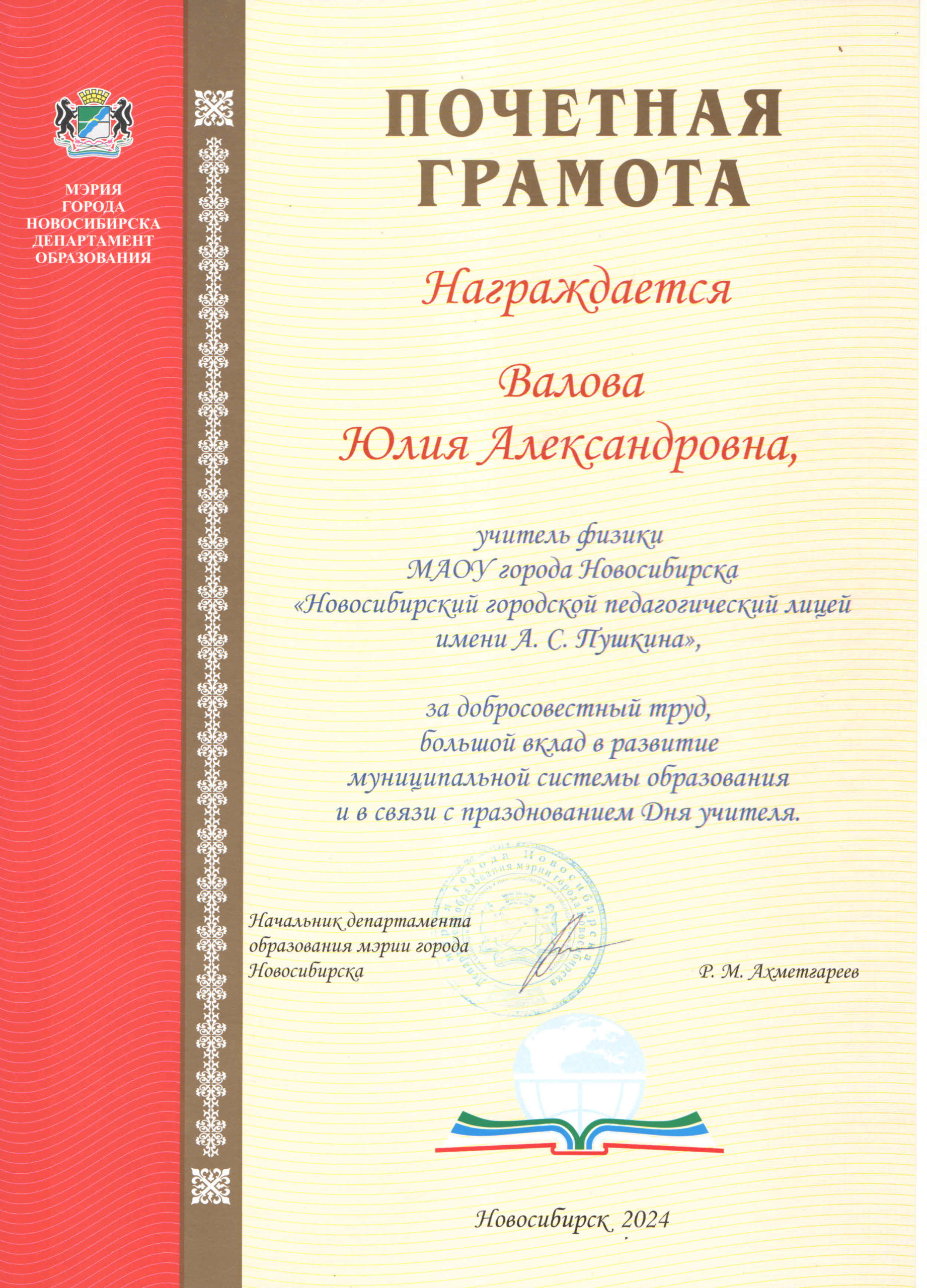 - Почетная грамота Департамента образования мэрии г. Новосибирска, август 2024 г.