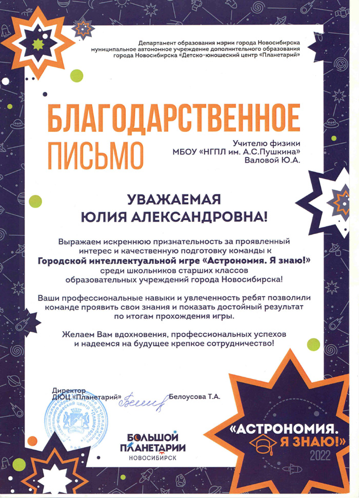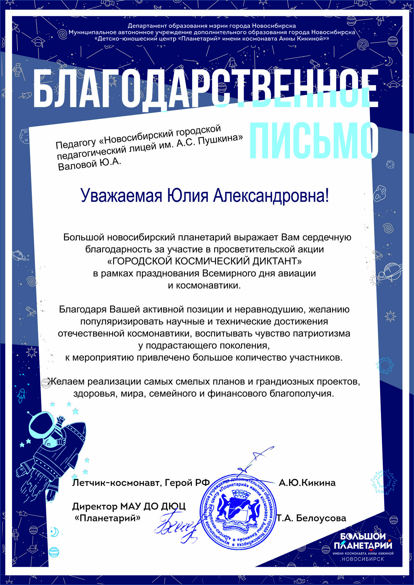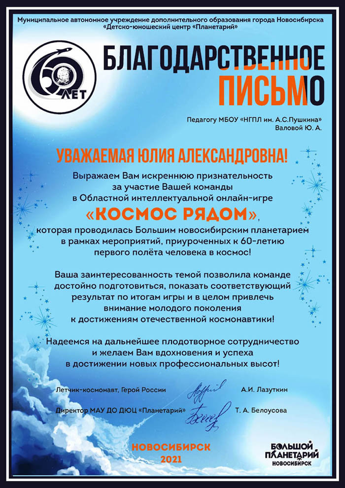 - Благодарственное письмо в просветительской акции «Городского космического диктанта» в рамках празднования Всемирного дня авиации и космонавтики. МАУ ДО ДЮЦ «Планетарий», апрель 2025 г.