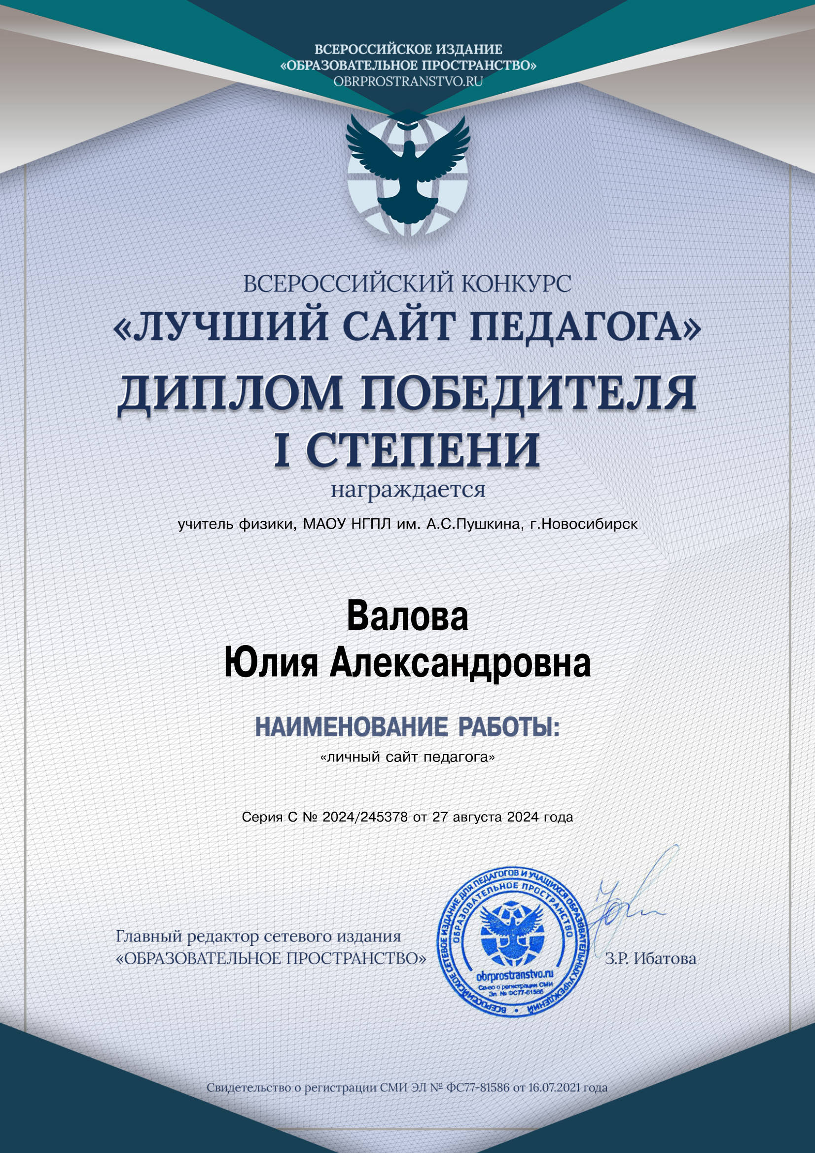 - Диплом победителя всероссийского конкурса «Лучший сайт педагога», проводимого всероссийским изданием «Образовательное пространство», август 2024 г.