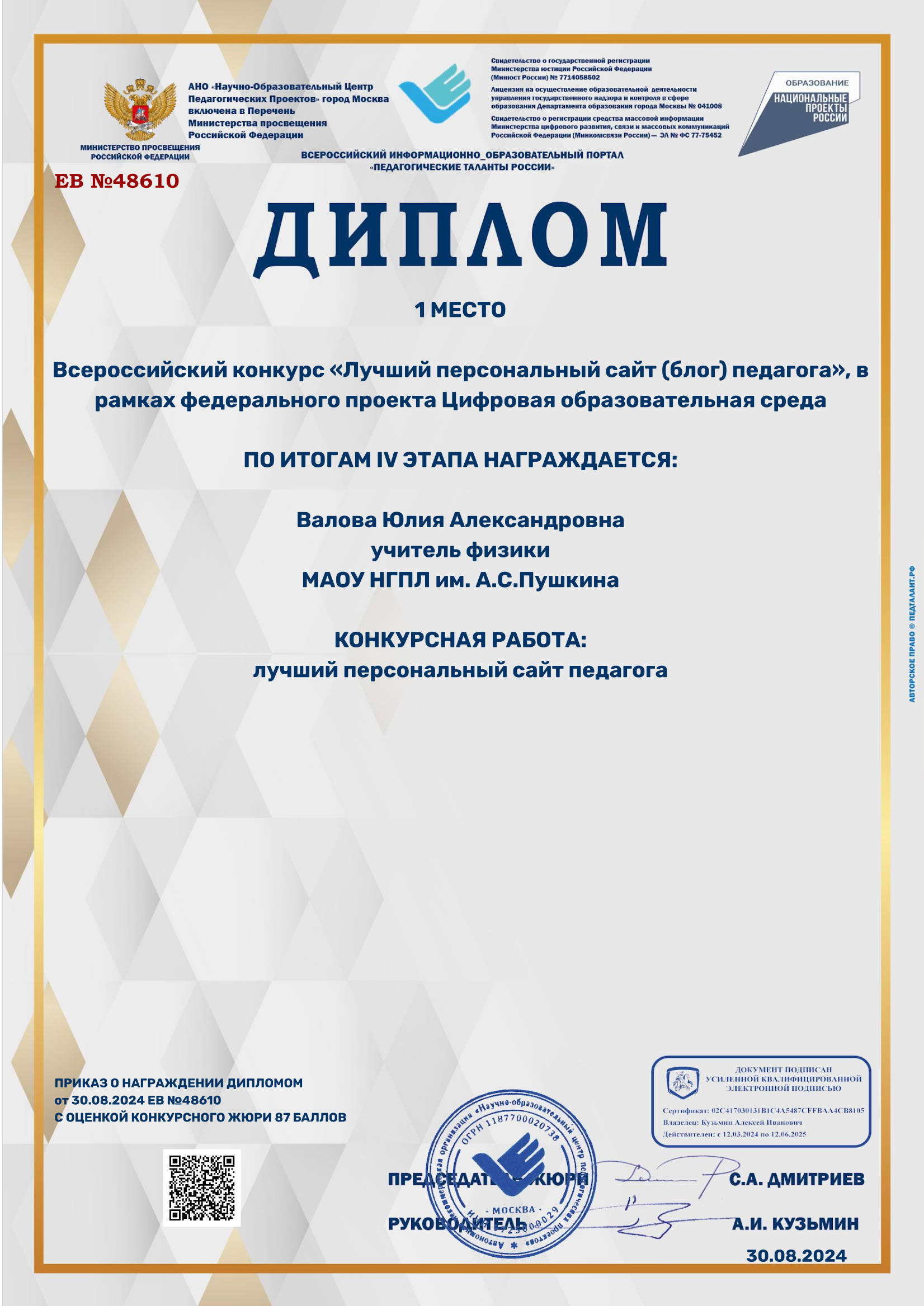 - Диплом победителя 1 степени Всероссийского конкурса «Лучший персональный сайт (блог) педагога» в рамках федерального проекта Цифровая образовательная среда (автономная некоммерческая организация «Научно-образовательный центр педагогических проектов» Москва Министерство юстиции Российской Федерации), август 2024 г.