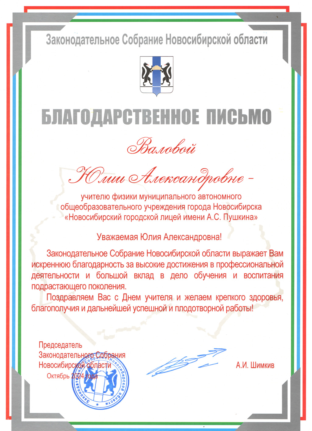 - Благодарственное письмо от Законодательного Собрания Новосибирской области, 8 октября, 2024 г.
