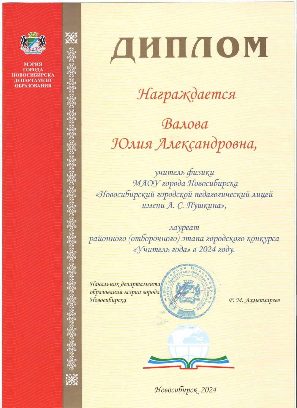 - Диплом лауреата районного (отборочного) этапа городского конкурса «Учитель года» в 2024 году, мэрия города Новосибирска департамент образования, декабрь 2024 г.