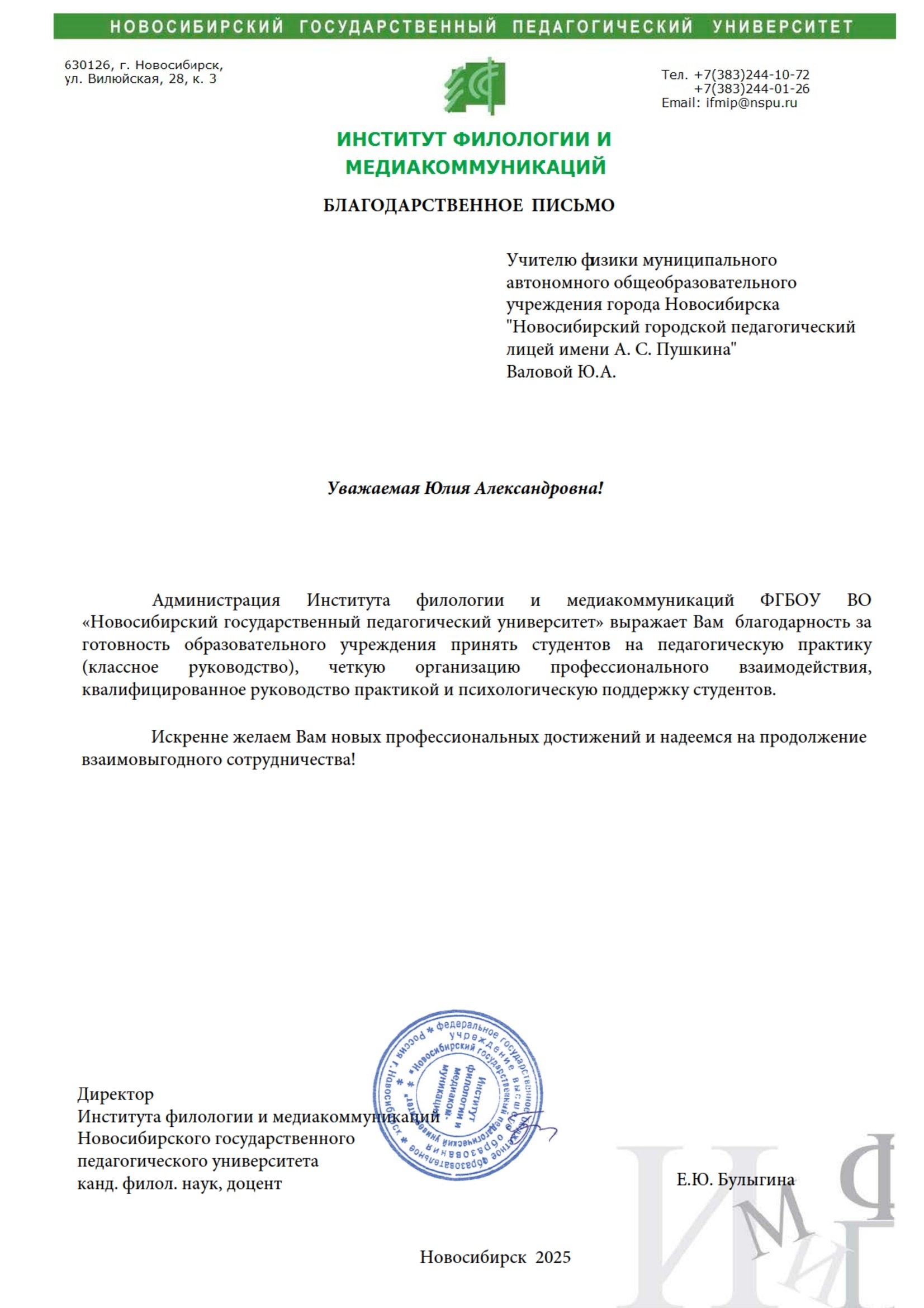 - Благодарственное письмо от администрации Института филологии и медиакоммуникаций ФГБОУ ВО «Новосибирский государственный педагогический университет», март 2025 г.