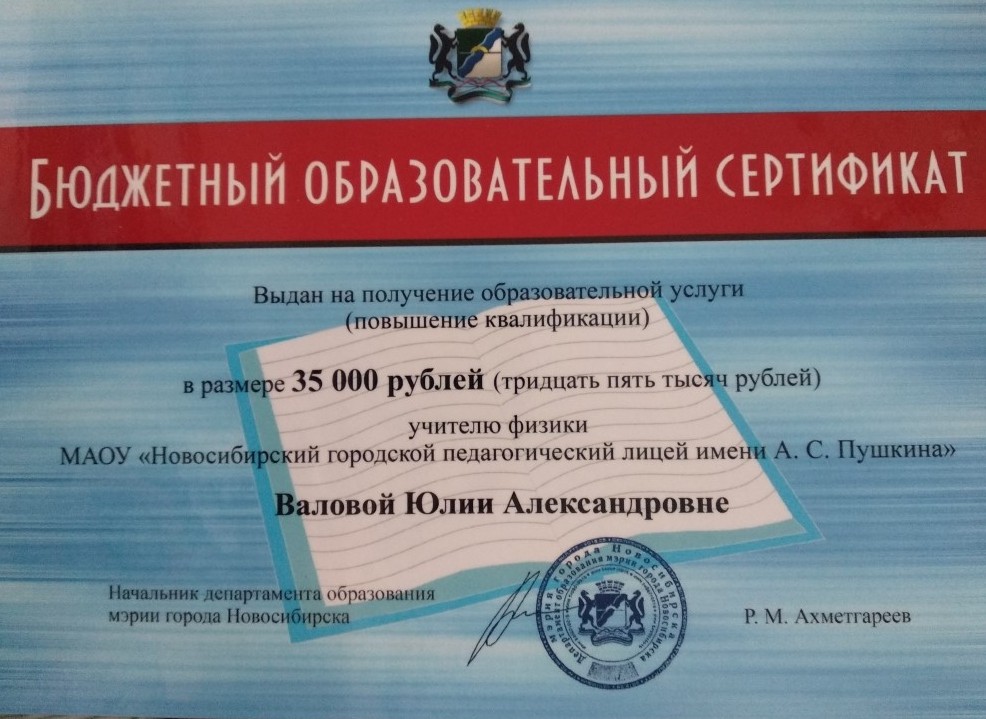 - Победитель городского конкурса на получение бюджетного образовательного сертификата. Департамент образования мэрии города Новосибирска совместно с Новосибирским Институтом Современного Образования. Февраль, 2025 г.