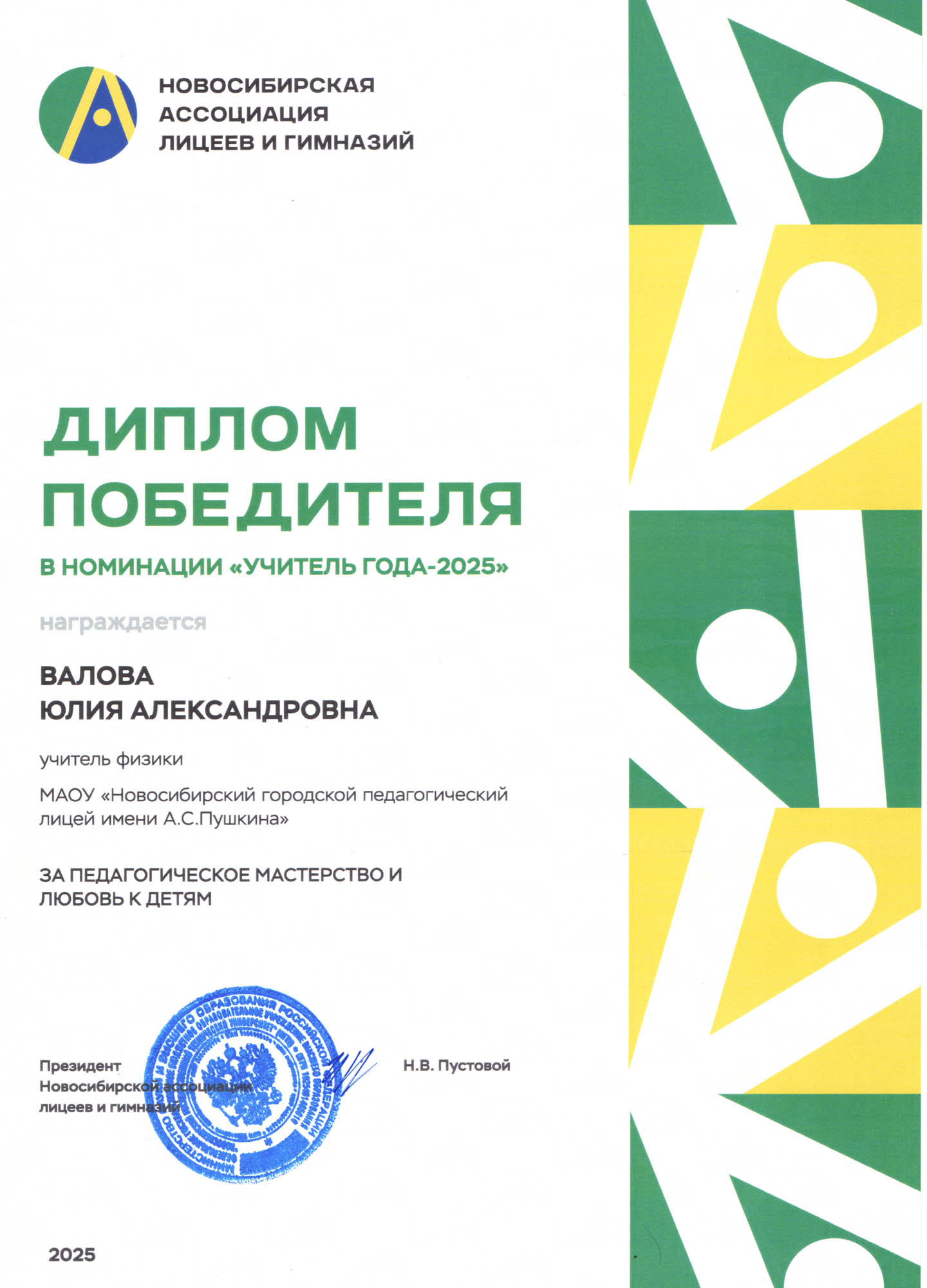 - Диплом победителя в номинации «Учитель года-2025», Новосибирская ассоциация лицеев и гимназий, 20 мая 2025 г.