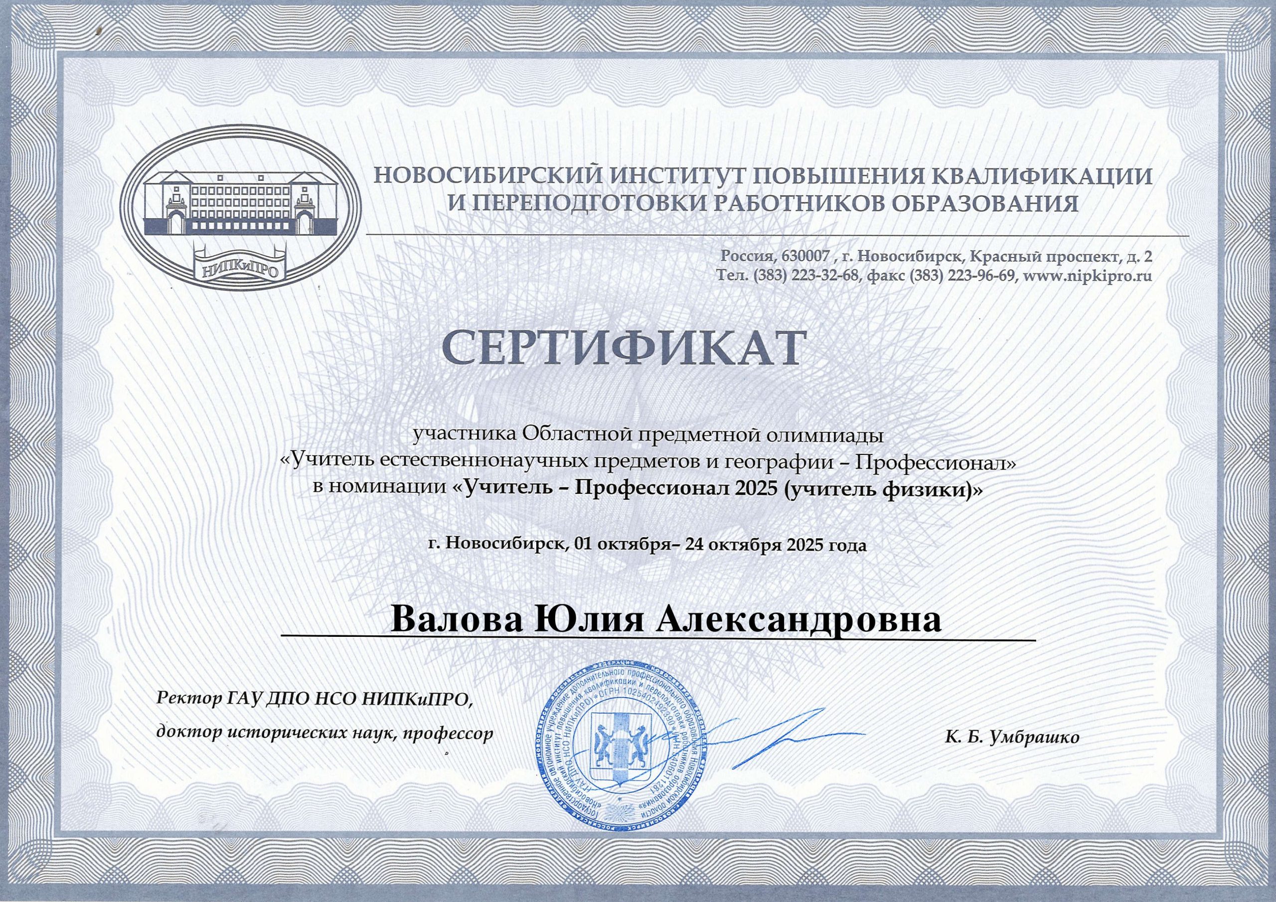 - Участие в областной предметной олимпиаде «Учитель естественнонаучных предметов и географии» , в номинации «Учитель — Профессионал 2025 (учитель физики)» ГАО ДПО НСО НИПКиПРО, 01.10 -24.10.2025 г.